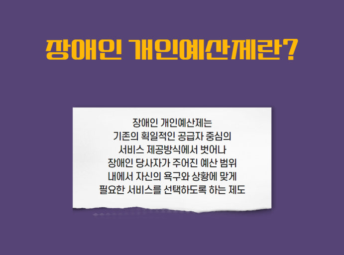 장애인 개인예산제는 장애인 대상 바우처 급여액의 일정 한도 내에서 당사자가 자신의 욕구와 상황에 따라 예산 이용계획을 수립한 대로 필요한 재화나 서비스(주류·담배 등 일부 불가)를 자유롭게 선택해 구입하도록 하는 제도다.